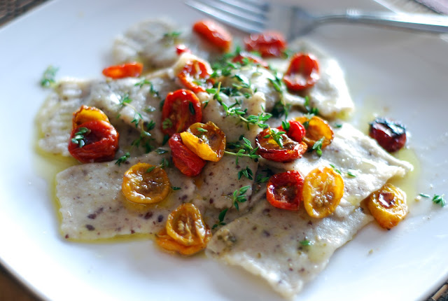 for 5 - 10 minutes to dry slightly. Bring a medium sized pot of water to boil. Gently place each pouch into the water and let boil [gentle boil] for 10 minutes. Pour into colander and, once all of the water has drained, pour onto plates. Top with roasted tomatoes [see recipe below], fresh thyme leaves, and a drizzle of olive oil.